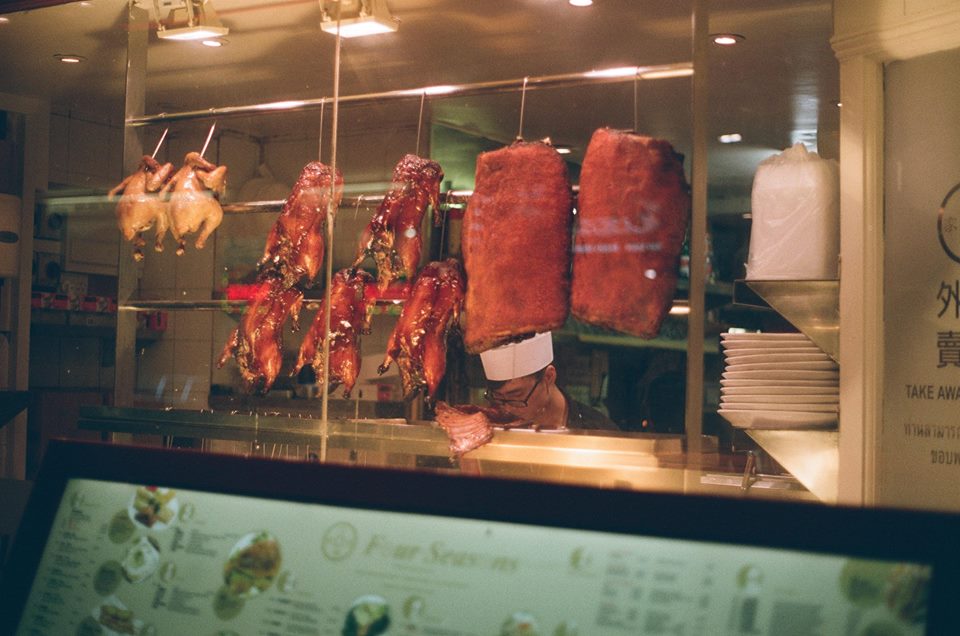 I really struggle with street photography, but love the genre. I think a tighter crop on this scene, cutting out the menu below and trying to frame the chef underneath the meat would have made for a better shot.
